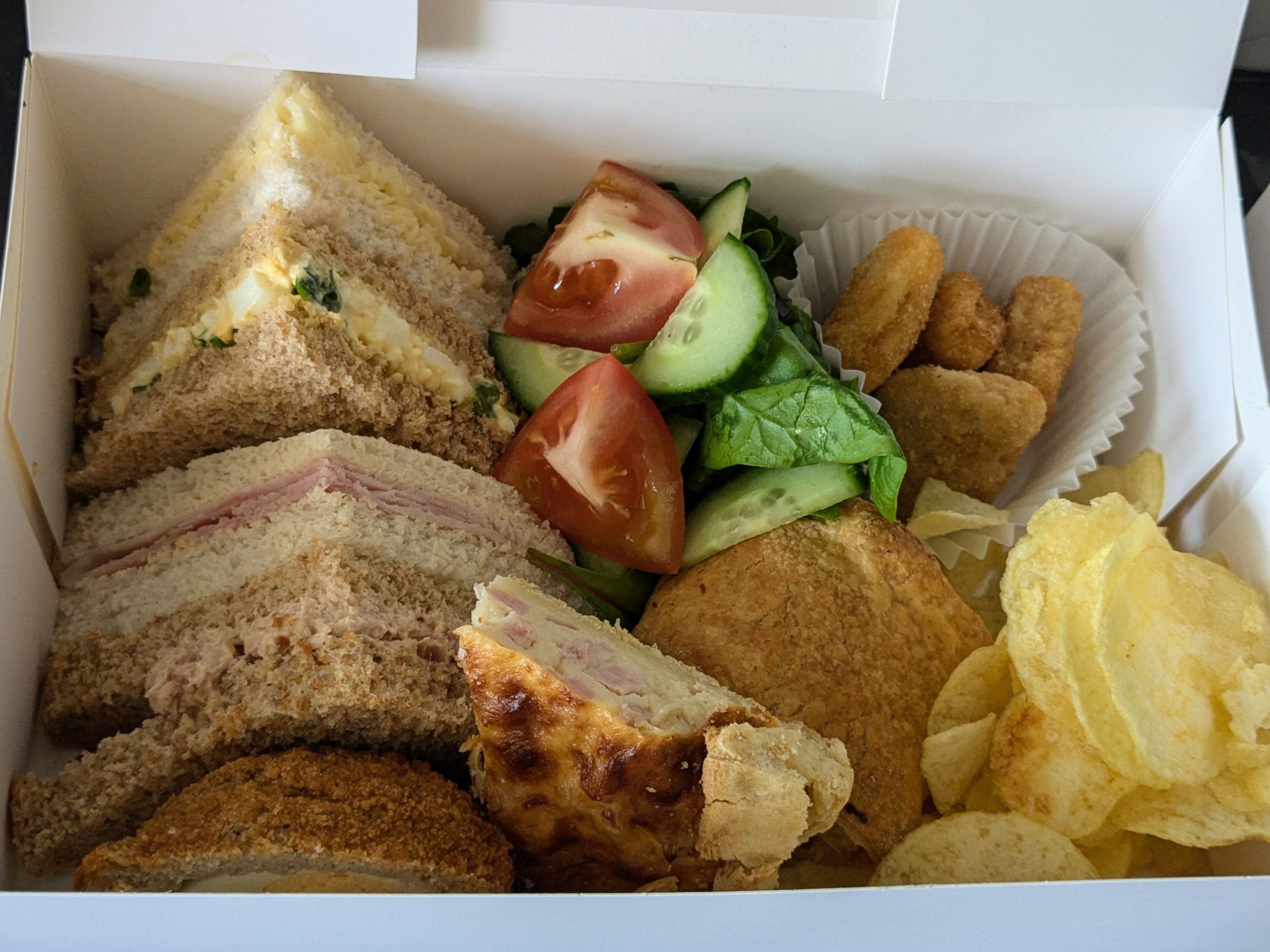 Perfect for Business Lunches and Small Gatherings! A Selection of Deep Filled Sandwiches, Homemade Sausage Roll, Quiche, Scotch Egg & Breaded Chicken Chunks. Served with Premium Brand Crisps and Fresh Juicy Salad.